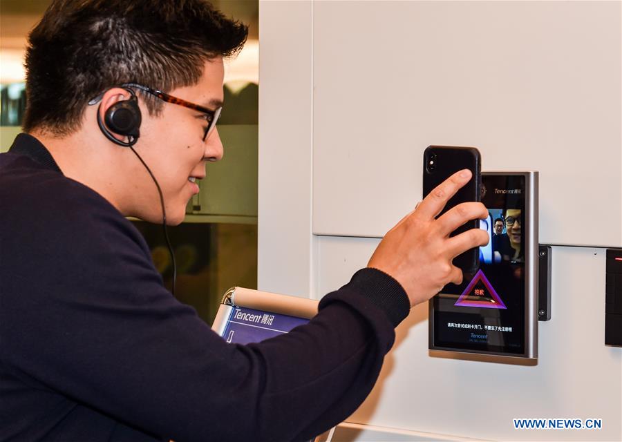Kenneth Fok, head of a youth delegation from Hong Kong, experiences face recognition at Tencent in Shenzhen, south China's Guangdong Province, June 26, 2018. A delegation of some 150 young representatives from south China's Hong Kong visited Hytera Communications Corporation and Tencent on Tuesday. (Xinhua/Mao Siqian)