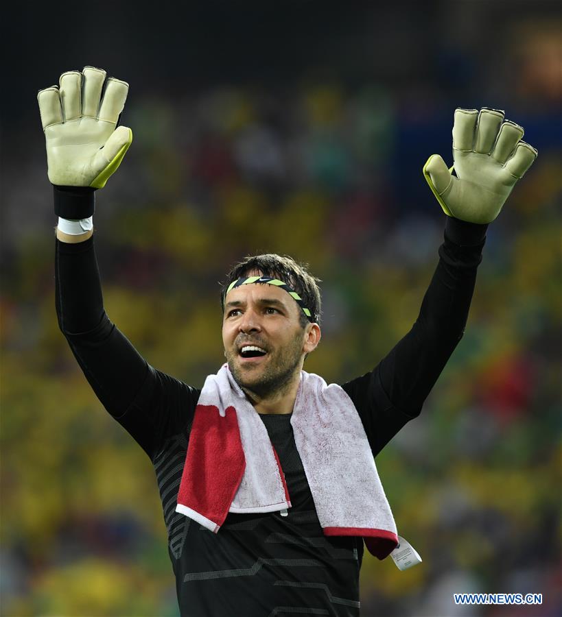 Goalkeeper Vladimir Stojkovic of Serbia greets the audience after the 2018 FIFA World Cup Group E match between Brazil and Serbia in Moscow, Russia, June 27, 2018. Brazil won 2-0 and advanced to the round of 16. (Xinhua/Du Yu)