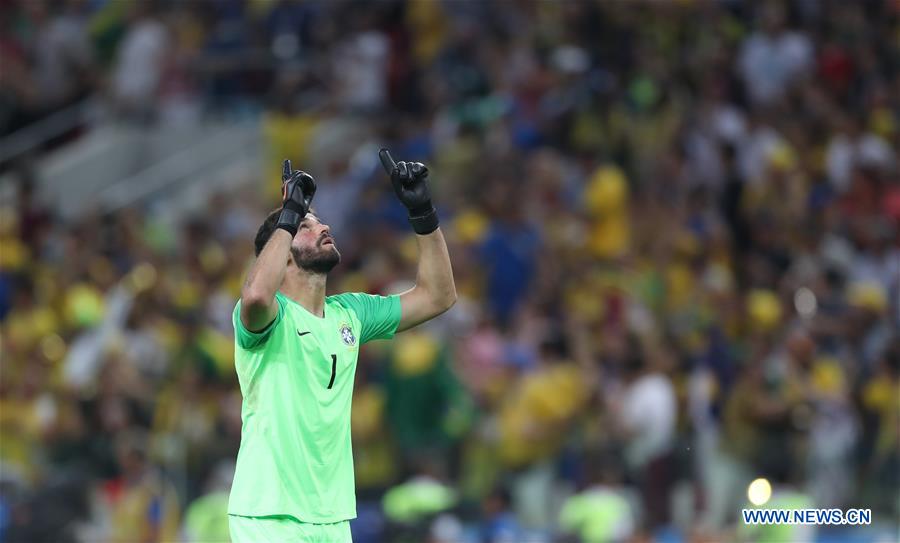 Goalkeeper Alisson of Brazil celebrates during the 2018 FIFA World Cup Group E match between Brazil and Serbia in Moscow, Russia, June 27, 2018. Brazil won 2-0 and advanced to the round of 16. (Xinhua/Xu Zijian)