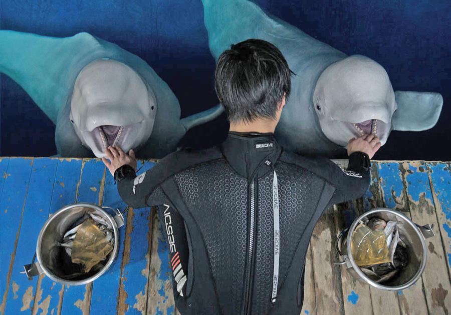 A trainer from Chengfeng Ocean World in Shanghai attends to Little White and Little Grey. (Photo: SEA LIFE TRUST Beluga Whale Sanctuary/for China Daily)