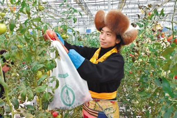 A woman picks up tomato at Zhizhao Pure Land agricultural technology demonstration center in Lhasa, Tibet autonomous region, Feb 10, 2016. [Photo/people.com.cn]