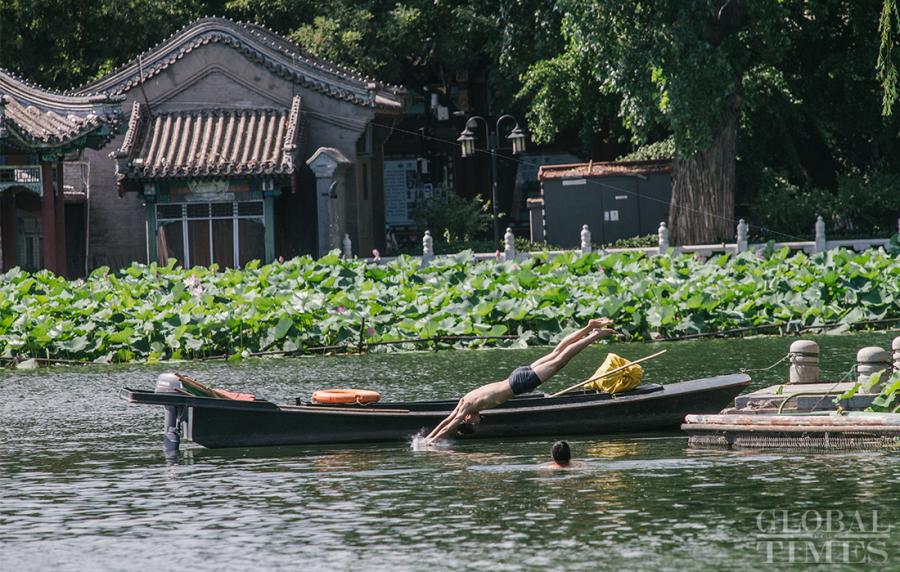 A man jumps into the water to cool off as temperatures hit 34 degrees in Beijing on Thursday. (Photo: Li Hao/GT)
