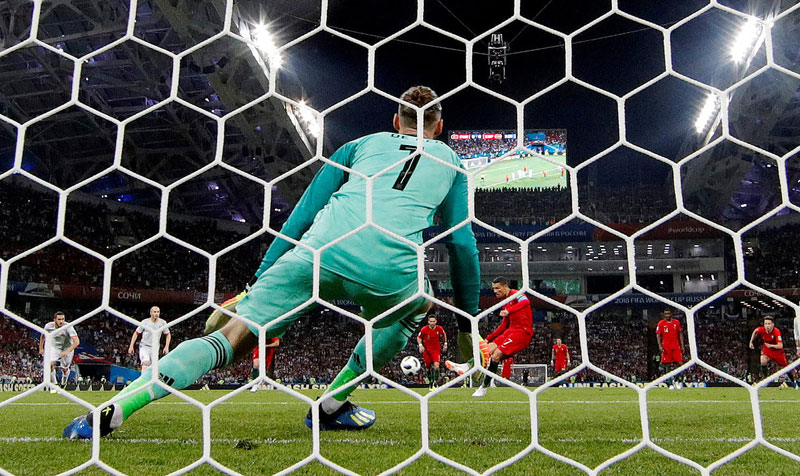 Portugal's Cristiano Ronaldo scores their first goal from the penalty spot past Spain's David De Gea during the 2018 FIFA World Cup Russia, June 15, 2018. [Photo/Agencies]