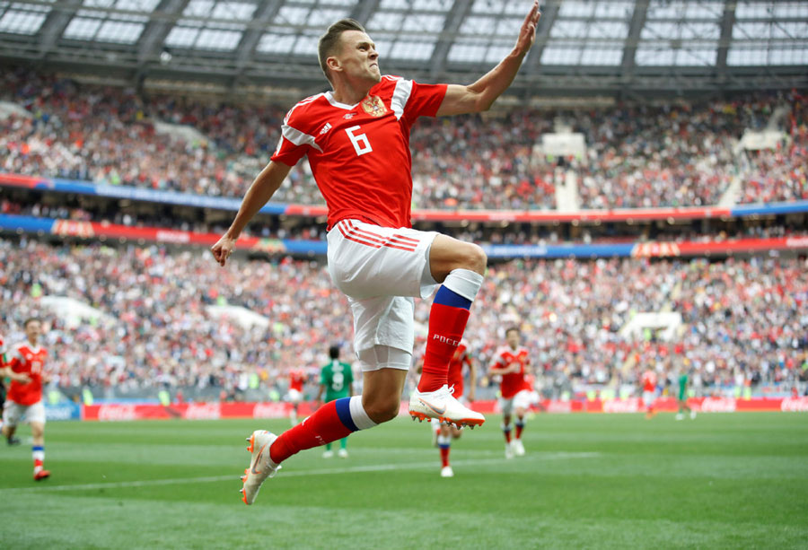 Russia's Denis Cheryshev celebrates scoring their second goal during the 2018 FIFA World Cup Russia Group A match between Russia and Saudi Arabia, at Luzhniki Stadium, on June 14, 2018. [Photo/Agencies]