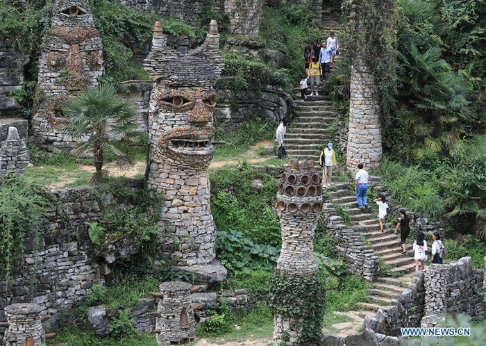 Tourists visit Song Peilun's stone castle "Yelang" in Leping Village of Huaxi District in Guiyang, southwest China's Guizhou Province, July 1, 2018. Song gave up an opportunity to stay in the United States as a cartoonist. Instead, he returned to a plot of wasteland in his home province of Guizhou. There, he decided to create a different kind of art. The castle grounds are home to more than 300 statues lining both sides of a creek. They resemble the huge human figures on Easter Island. Song drew inspiration from local Nuo opera, a tradition in which people wear masks and dance to drive away evil spirits. (Xinhua/Ou Dongqu)