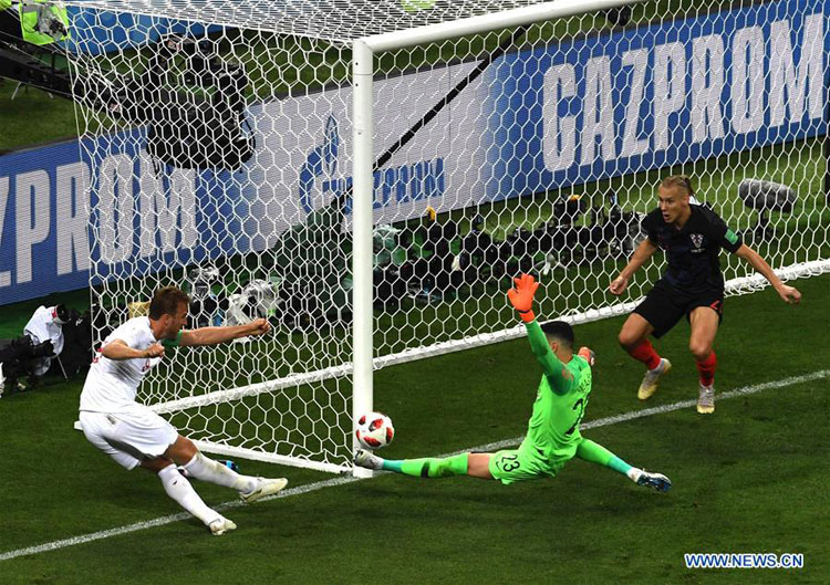 Goalkeepers Danijel Subasic (C) of Croatia saves a shot by Harry Kane of England (L) during the 2018 FIFA World Cup semi-final match between England and Croatia in Moscow, Russia, July 11, 2018. (Xinhua/Wang Yuguo)