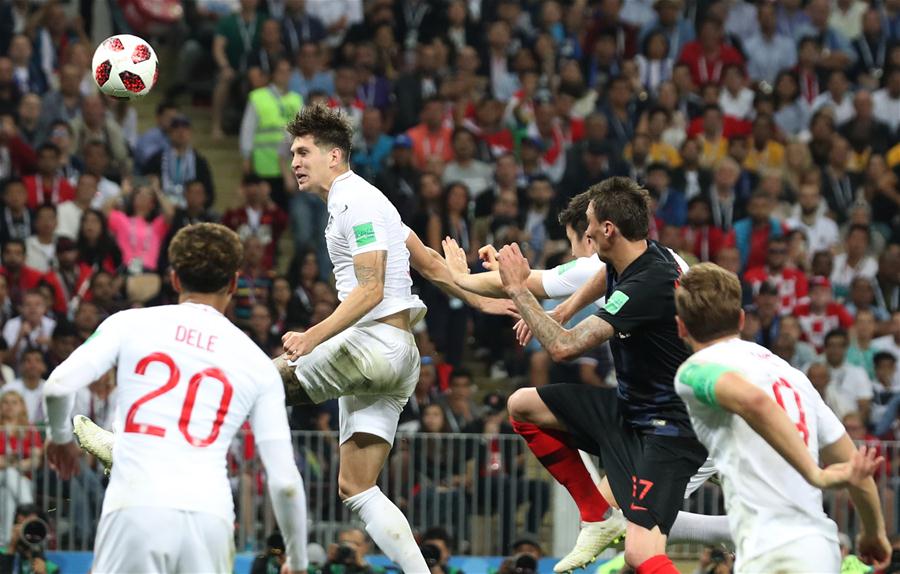 John Stones (top) of England competes for a header during the 2018 FIFA World Cup semi-final match between England and Croatia in Moscow, Russia, July 11, 2018. (Xinhua/Cao Can)