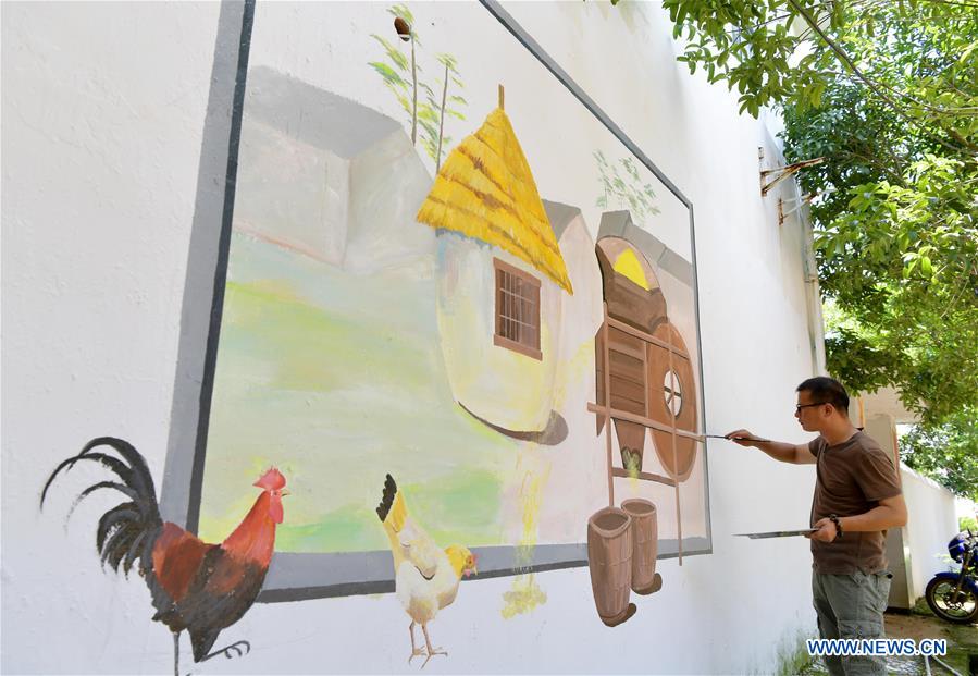 Painter Li Jun draws a 3D wall picture in Datang Village of Gongqingcheng City, east China's Jiangxi Province, July 10, 2018. Local government has made efforts in recent years to overhaul the living environment of villages. (Xinhua/Peng Zhaozhi)