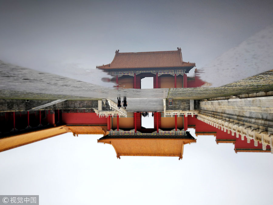 A heavy rainfall in Beijing creates a rare scene at the Forbidden City on Wednesday. [Photo/VCG]