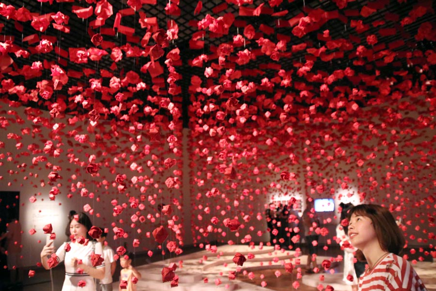 Chinese artist Liu Tong's latest solo exhibition, Reviving the Inner Child, features origami artworks inspired by the fairytale book, ushering visitors into a colorful world full of imagination. A room decorated with 6,700 origami roses is one highlight of the show.