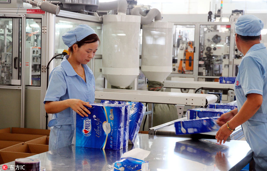 Workers of Hengan Group pack tissue paper on the production line, on Aug 23, 2016. [Photo/IC]