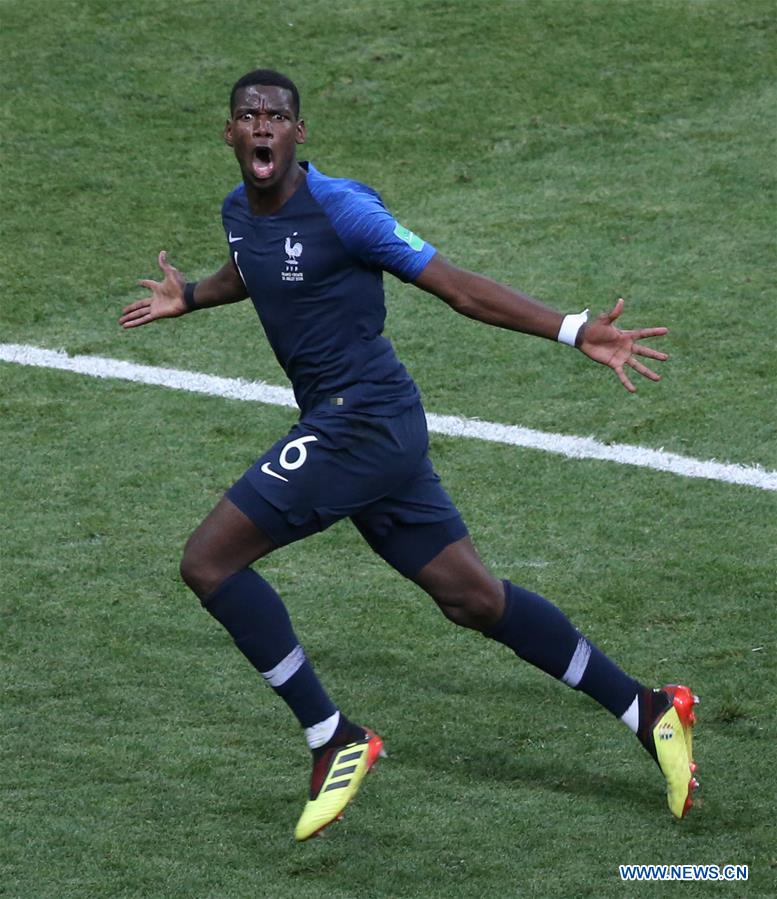 Paul Pogba of France celebrates scoring during the 2018 FIFA World Cup final match between France and Croatia in Moscow, Russia, July 15, 2018. (Xinhua/Li Ming)