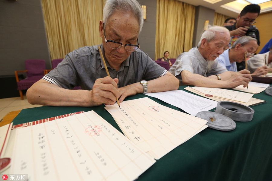 Senior professors write admission letters at Shaanxi Normal University in Xi'an, Shaanxi province, July 16, 2018. [Photo/IC]