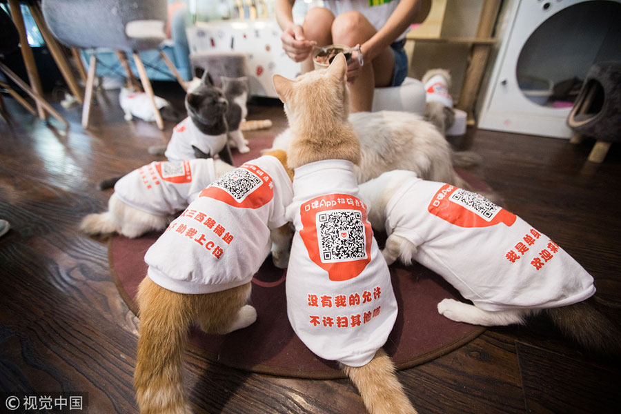 Cats wearing shirts printed with QR codes gather at the Cat Fairy cafe in Hangzhou, East China's Zhejiang province, July 16, 2018. [Photo/VCG]