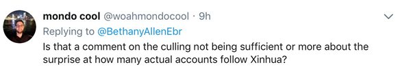 “Is that a comment on the culling not being sufficient or more about the surprise at how many actual accounts follow Xinhua [and other Chinese media outlets],” a different Twitter user responded.