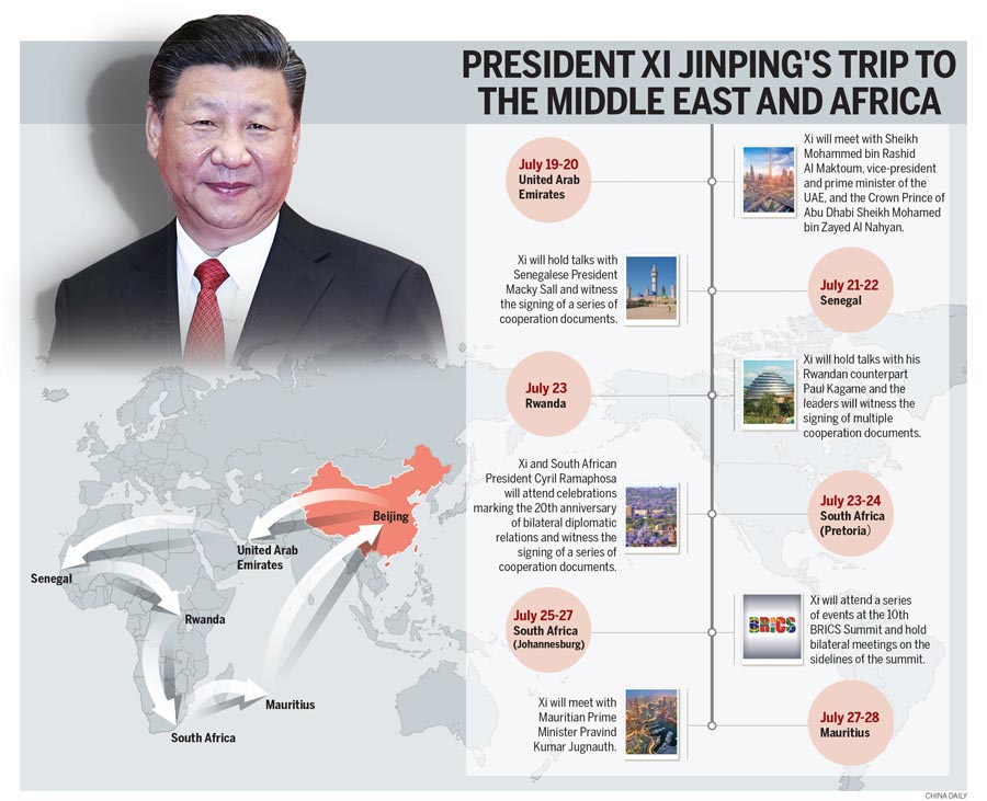 After visiting the UAE, Xi will make state visits to Senegal, Rwanda and South Africa, attend the 10th BRICS Summit in Johannesburg and visit Mauritius during a stopover. The trip ends on July 28.