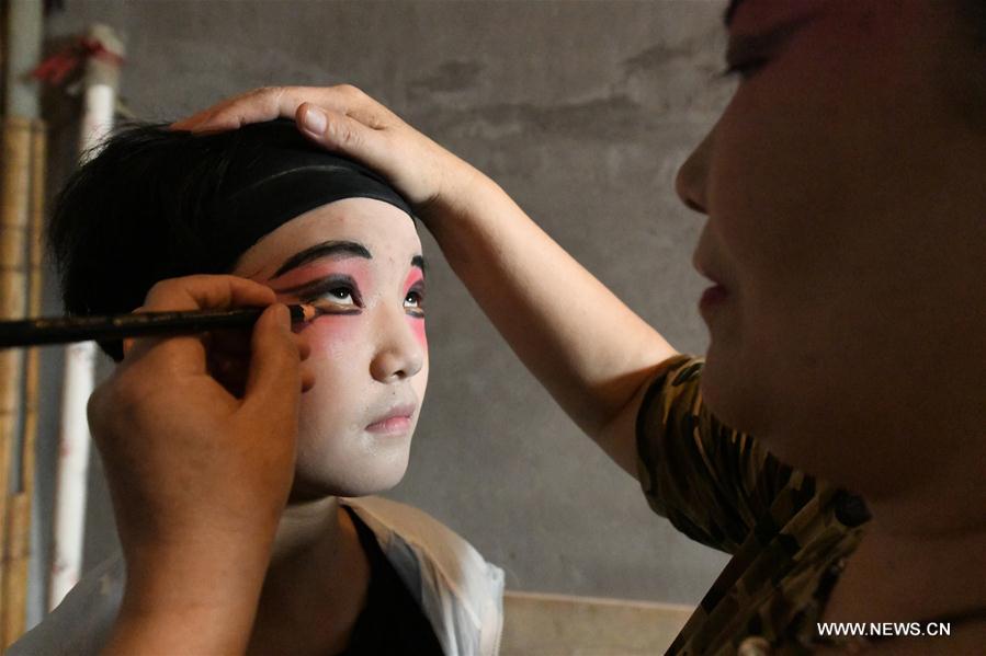 A teacher does facial make-up during an opera class for a student from a primary school in Shijiazhuang, north China's Hebei Province, July 18, 2018. Chinese students have entered their summer vacation, during which many of them chose to spend the vacation by developing their hobbies. (Xinhua/Chen Qibao)