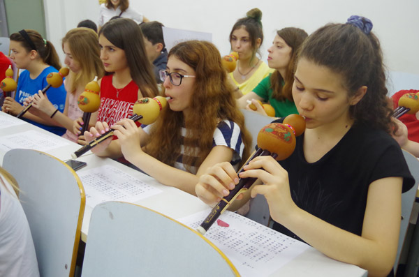 Teenagers from Europe learn to play the hulusi, a traditional musical instrument of the Dai ethnic group in China, at a recent summer camp in Beijing. [PHOTO BY XING WEN/CHINA DAILY]