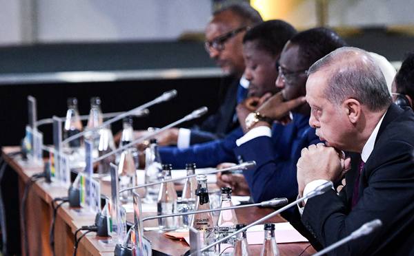 JOHANNESBURG, SOUTH AFRICA - JULY 27, 2018: The Presisent of Turkey Recep Tayyip Erdogan, the President of Senegal Macky Sall, the President of Togo Faure Gnassingbe, and the President of Rwanda Paul Kagame (from R) at a meeting on Day 3 of the 10th BRICS Summit. (Photo from CFP)