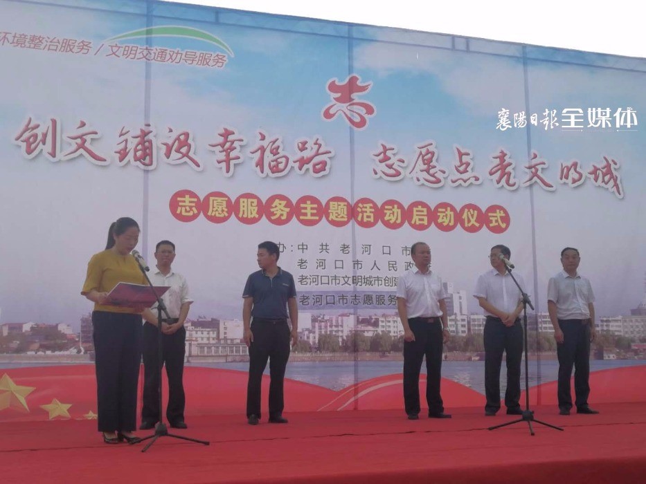 On the morning of July 30, the launch ceremony of Laohekou City under Xiangyang "Civilization Creation Paves the Way for Civilized City and Volunteerism Lightens Civilized City" volunteer service themed activity was held on the Anti-Japanese Square. Nearly 300 volunteers from Laohekou City attended the initiation ceremony.