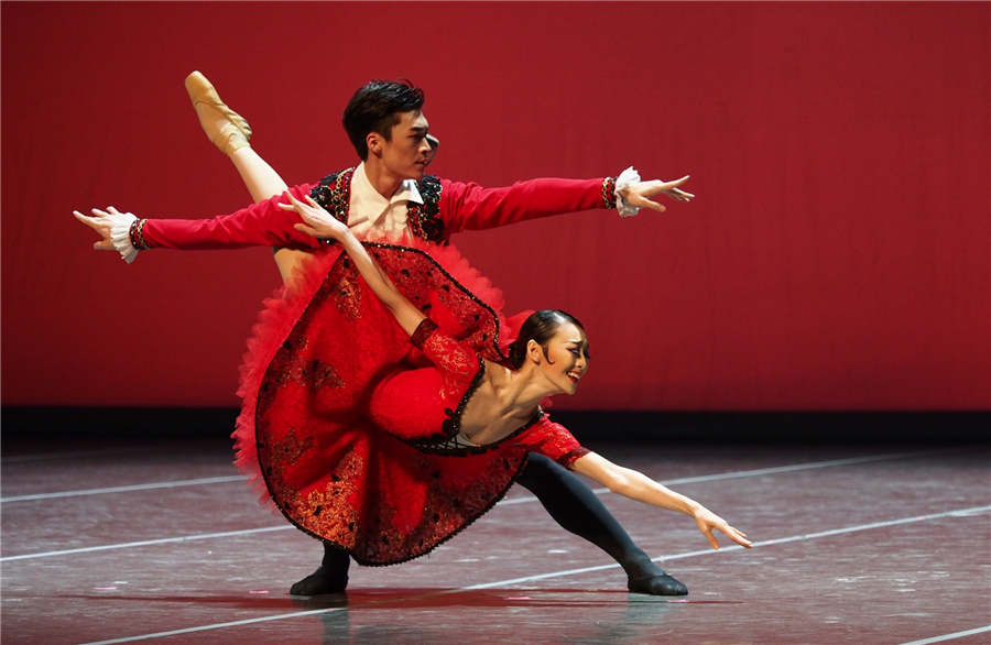 Chinese contestant Ao Dingwen (bottom) performs with her partner during the Sixth Shanghai International Ballet Competition in Shanghai, East China, Aug 11, 2018. The competition closed here on Saturday. [Photo/Xinhua]