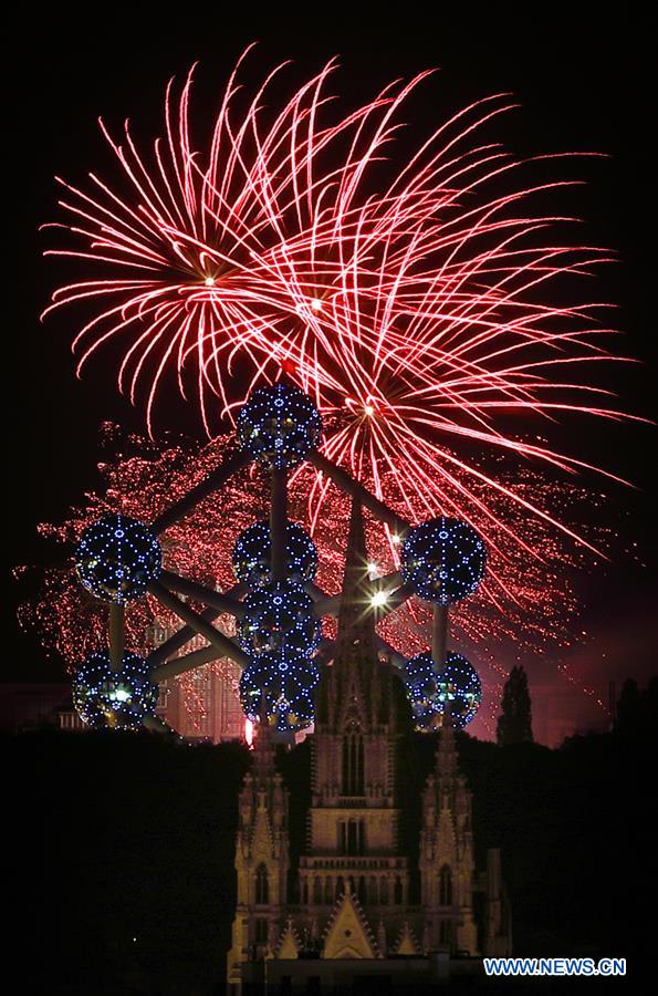 Fireworks light up the sky and the famous Atomium landmark during Laeken Fireworks 2018 in Brussels, Belgium, Aug. 24, 2018. (Xinhua/Zheng Huansong)