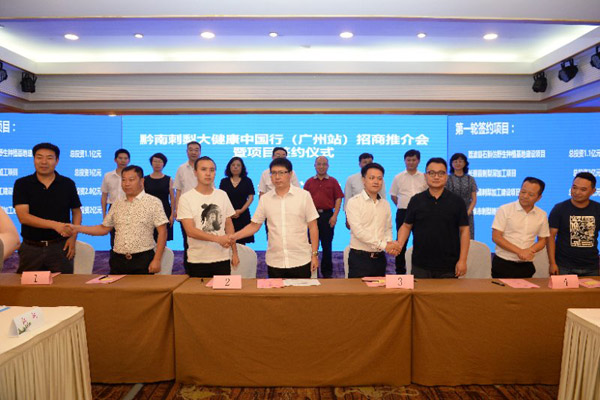 Qiannan prefecture in Southwest China's Guizhou province signed a total of 16 investment and cooperative agreements with companies from Guangdong province in the Guangdong provincial capital on Aug 27, 2018. [Photo provided to chinadaily.com.cn]