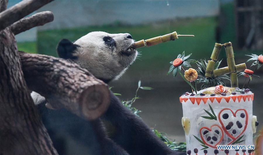 Giant panda Yuan Yuan enjoys a special birthday cake at Taipei Zoo in Taipei, southeast China's Taiwan, Aug. 30, 2018. Born two days later than Yuan Yuan in 2004, giant panda Tuan Tuan also celebrated its 14th birthday together with Yuan Yuan on Thursday. Yuan Yuan and Tuan Tuan were given as a goodwill gift to Taiwan by the Chinese mainland. (Xinhua/Xue Yubin)