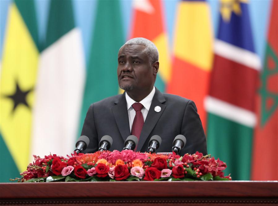 Moussa Faki Mahamat, chairperson of the African Union (AU) Commission, addresses the opening ceremony of the Beijing Summit of the Forum on China-Africa Cooperation (FOCAC) at the Great Hall of the People in Beijing, capital of China, Sept. 3, 2018. (Xinhua/Huang Jingwen)