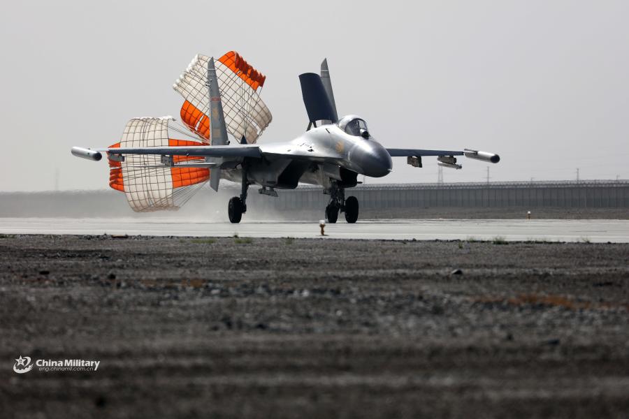 A J-11 fighter jet attached to an aviation brigade of the air force under the PLA Western Theater Command deploys its drogue parachute to slow itself after landing at a military airfield during the flight training exercise in the hinterland of the Kunlun Mountains in early September, 2018. (Photo/eng.chinamil.com.cn)