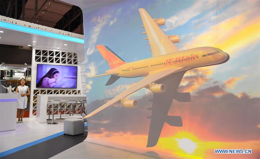 Photo taken on Sept. 16, 2018 shows an exhibition area during the annual conference of global aviation World Routes in Guangzhou, south China's Guangdong Province. (Xinhua/Deng Hua)
