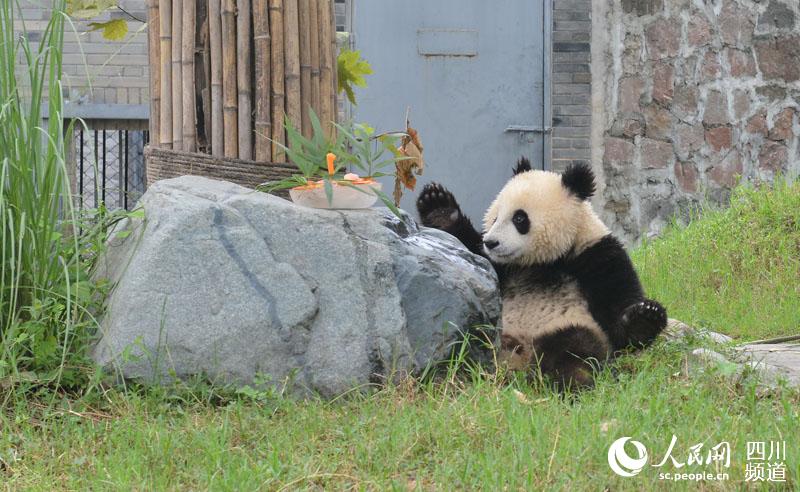 A panda in the Dujiangyan Base of the China Conservation and Research Center for Giant Pandas.