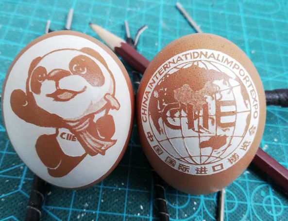 Li has created several egg sculptures for the upcoming 2018 China International Import Expo, engraving the expo’s mascot and logo onto chicken eggs. These works of art, plus other creations, will be displayed during the exhibition, Li disclosed.