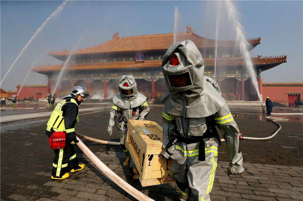 Drills are staged frequently at the Palace Museum in Beijing, where a team is stationed by the east gate to keep watch for fire in turn 24 hours a day. JIANG DONG/WANG KAIHAO/CHINA DAILY
