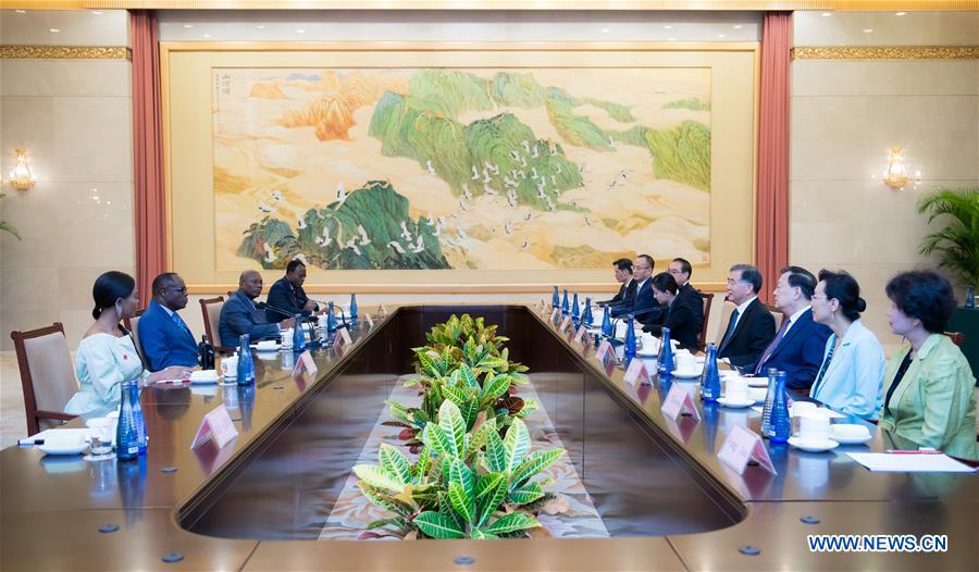Wang Yang, chairman of the National Committee of the Chinese People's Political Consultative Conference (CPPCC), meets with Mokolo Wa Mpombo, Democratic Republic of Congo's first deputy speaker of the Senate, in Beijing, capital of China, Sept. 26, 2018. (Xinhua/Zhai Jianlan)