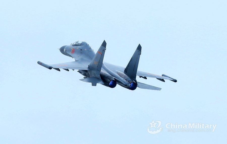 A J-11 fighter jet attached to an aviation brigade of the air force under the PLA Southern Theater Command soars over the sky during a flight training exercise on Sept. 28, 2018. (eng.chinamil.com.cn/Photo by Tang Jun)