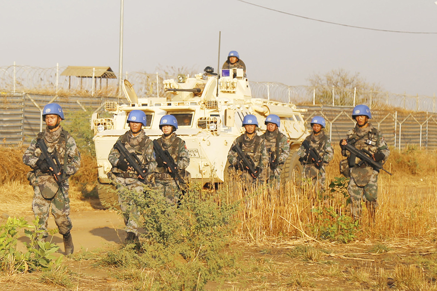Chinese peacekeepers patrol in Juba, capital of South Sudan, to protect the population during the May Day holiday. WANG TENG / XINHUA