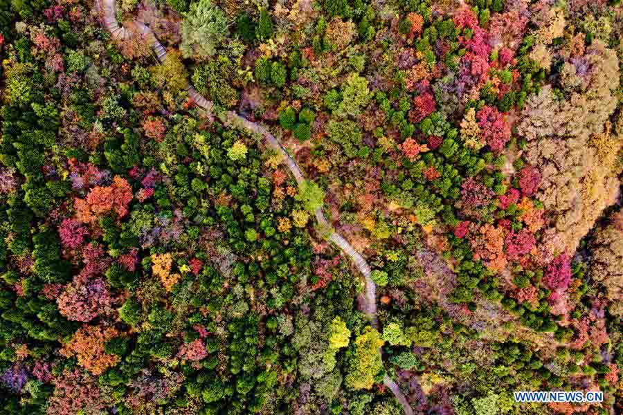 Aerial photo taken on Oct. 10, 2018 shows a view of the Badaling section of the Great Wall in the Badaling red leaf scenic area in the Yanqing District of Beijing, capital of China. (Xinhua/Wang Tiezhong)