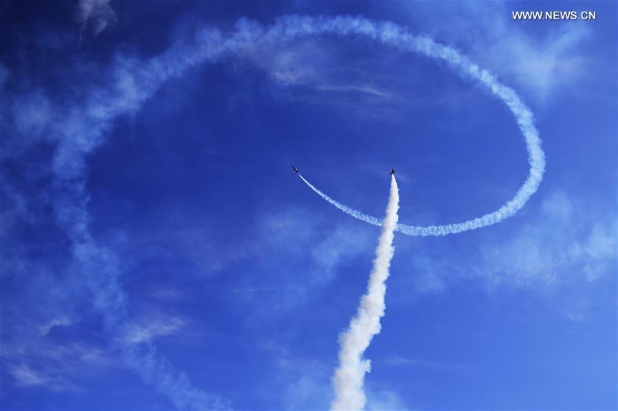 Photo taken on Oct. 13, 2018 shows model aircrafts with turbojet engines perform in the air during a contest in Rongcheng, east China's Shandong Province. A total of 12 teams from around the world compete in the air. (Xinhua/Lin Haizhen)