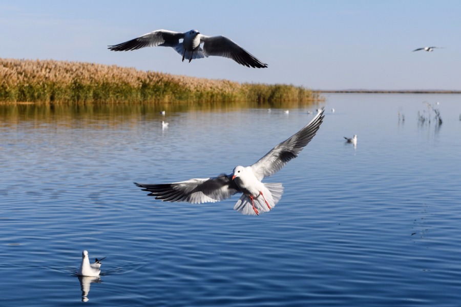 Photo taken on Oct 12, 2018 shows birds flying on the surface of Juyan Lake in Ejina Banner, North China's Inner Mongolia autonomous region.[Photo/Xinhua]
