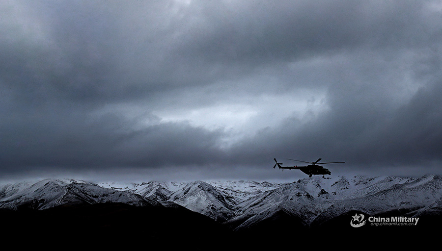 A helicopter attached to the air force under the PLA Western Theater Command patrols the snow-covered mountain area during a flight training exercise in an undisclosed plateau area on October 18, 2018. (eng.chinamil.com.cn/Photo by Liu Yinghua)