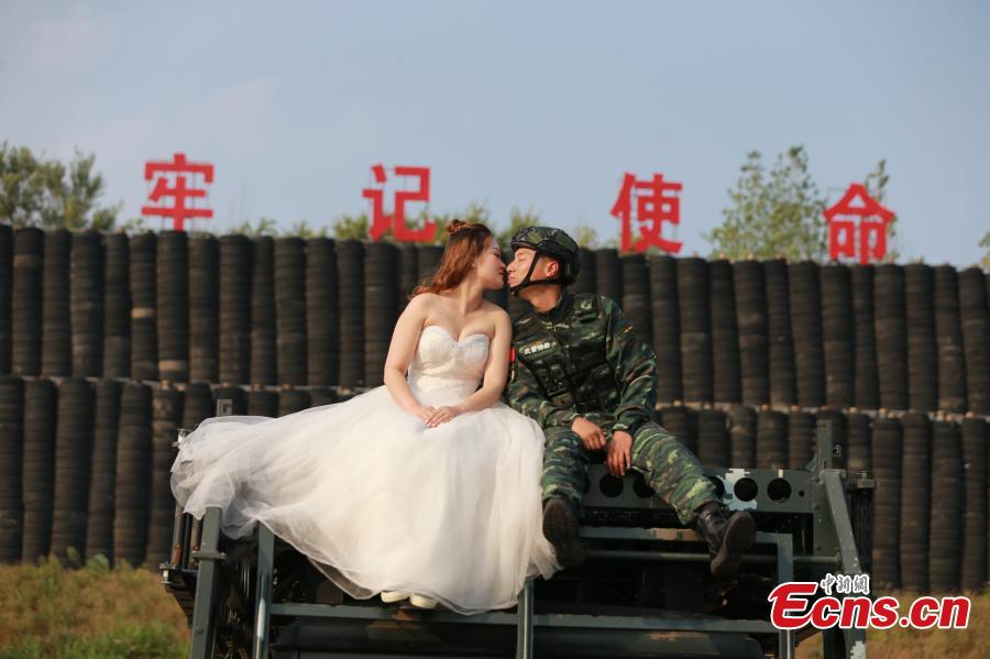 An armed police squad head in Yantai City, East China’s Shandong Province and his wife took special wedding photos at a barrack amid cheers and support of other members of the paramilitary police unit. (Photo: China News Service/Yang Lei)