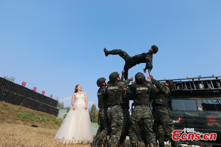 An armed police squad head in Yantai City, East China’s Shandong Province and his wife took special wedding photos at a barrack amid cheers and support of other members of the paramilitary police unit. (Photo: China News Service/Yang Lei)