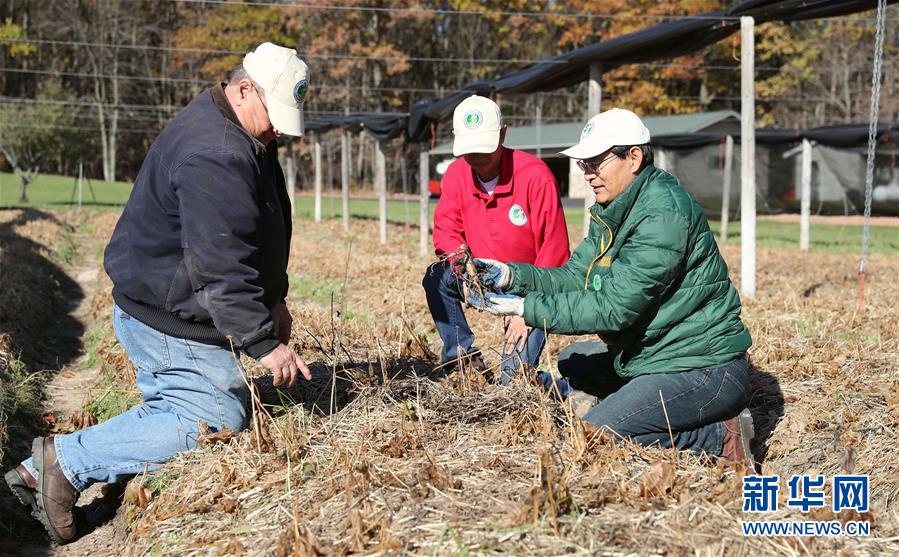 Jiang Mingtao (right) digs Ginsengs in a farm in Marathon County in the U.S. state of Wisconsin on Oct. 22, 2018. (Xinhua/Wang Ping)