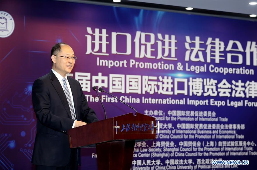 Lu Pengqi, vice chairman of the China Council for the Promotion of International Trade, speaks at the first China International Import Expo Legal Forum in Shanghai, east China, Nov. 6, 2018. The forum with the theme of “Import Promotion & Legal Cooperation”is held here on Tuesday. (Xinhua/Liu Ying)