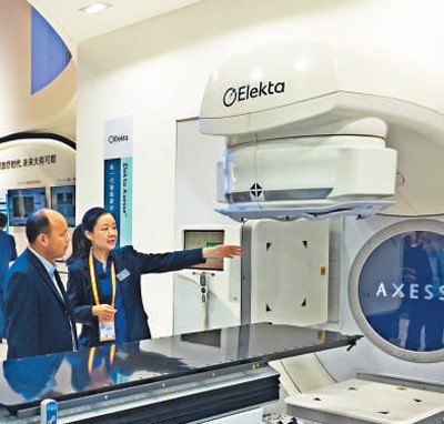 An employee of Elekta introduces the Elekta Axesse, the company’s newest smart digital platform for radiation therapy of tumor. Photo by Huang Chao from People’s Daily