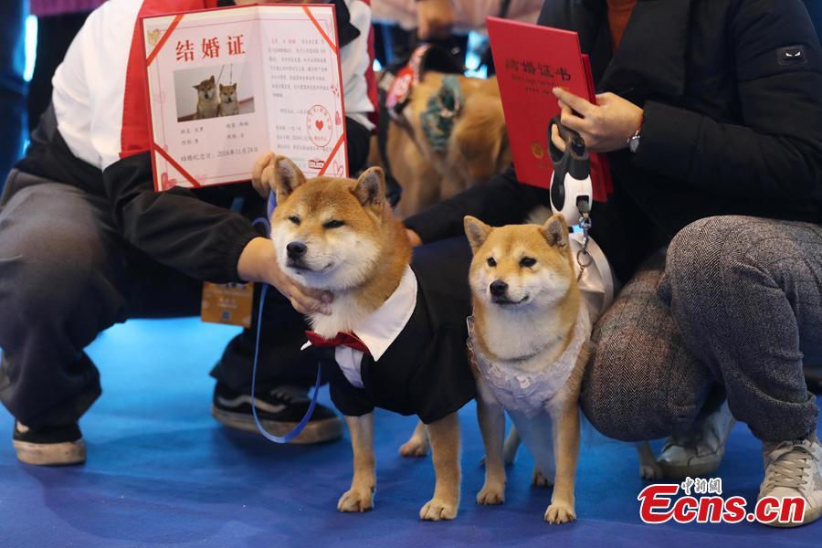 Pet dog owners pose for a photo with their dogs at the 2108 China (Nanjing) Pet Culture Festival in Nanjing, Jiangsu Province, Nov. 24, 2018. A "group wedding" was held for nearly 100 pet dogs of different breeds at the festival (Photo: China News Agency/Yang Bo)