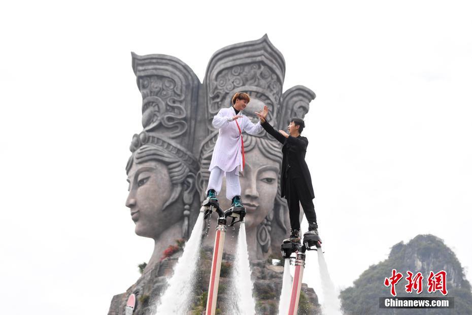 Two men perform Tai Chi using flyboards at a tourism resort in Guilin, Guangxi Zhuang Autonomous Region, on November 24, 2018. [Photo: Chinanews.com]