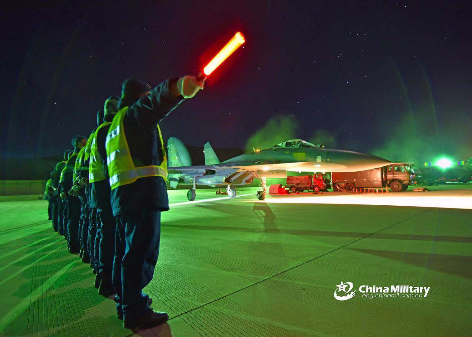 Maintenance men assigned to an aviation brigade of the air force under the PLA Western Theater Command signal a J-11 fighter jet to taxi out during a night flight training exercise on November 27, 2018. (eng.chinamil.com.cn/Photo by Chen Qingshun)