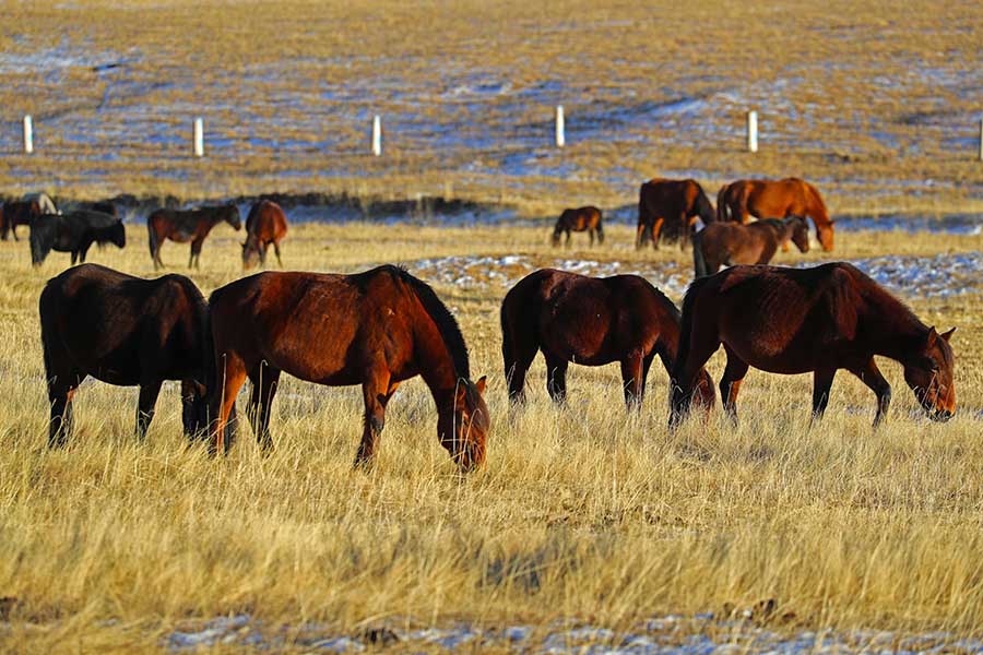 Horses graze on the prairie at the Shandan Military Horse Farm, NW China's Gansu province, during the winter.[Photo by Cheng Lin for chinadaily.com.cn]